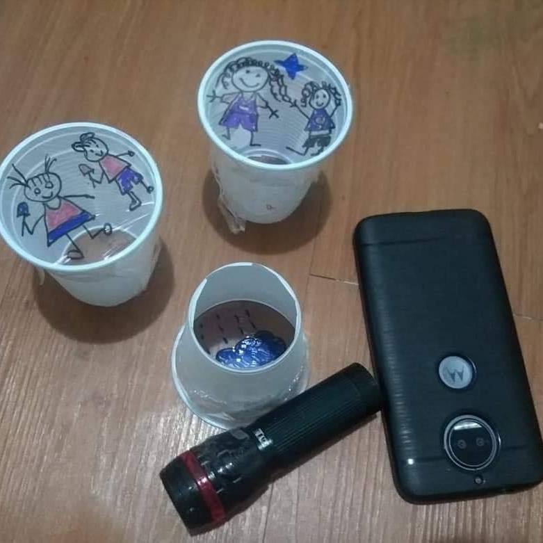 Retirando-se o fundo de um copo descartável podemos fazer uma lanterna diferente, colocando um plástico no fundo e desenhando nesse plástico e, depois, projetando o desenho em uma parede com o auxílio de uma lanterna.