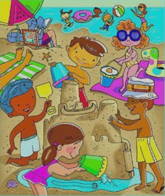 - Imagens para que elas encontrem o que for pedido, exemplo de perguntas: “o que é grande e está em cima da toalha de praia?” ou “onde está a melancia?;