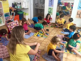 A sugestão é o livro “O lenço” de Patricia Auerbach, para ser contado com a participação das crianças, pois trata-se de um livro imagem. A proposta para que a brincadeira aconteça é que, após a leitura do livro, seja colocado a música “Pano encantado”, seguido da distribuição de tecidos e tnts para que eles possam brincar conforme a música. Quando a música terminar, brincar da maneira como quiserem, explorando as diversas formas de brincar com o tecido, etc.